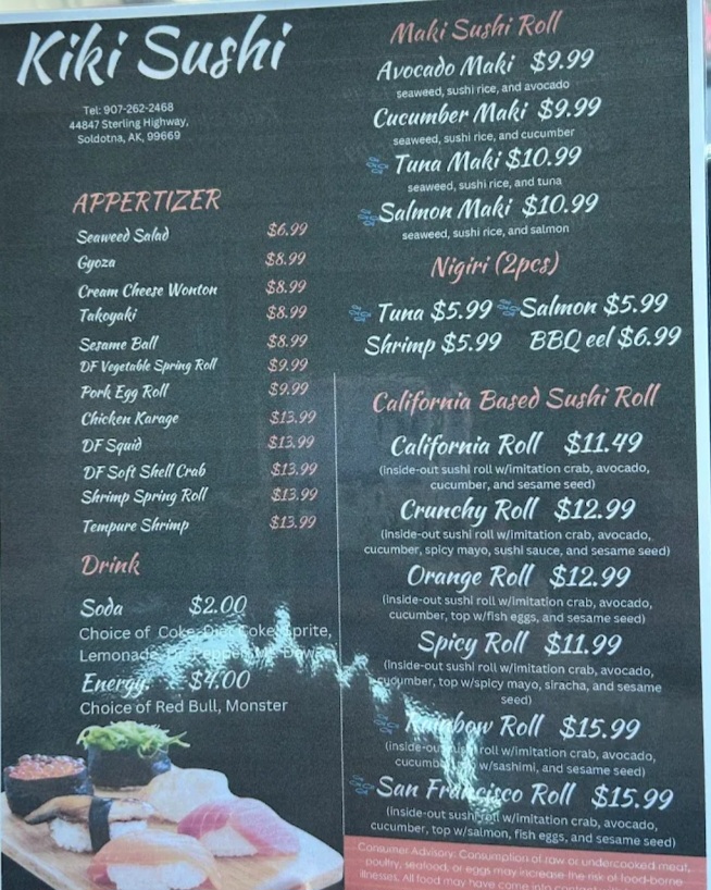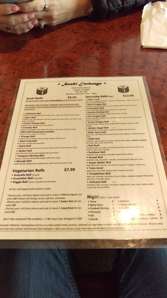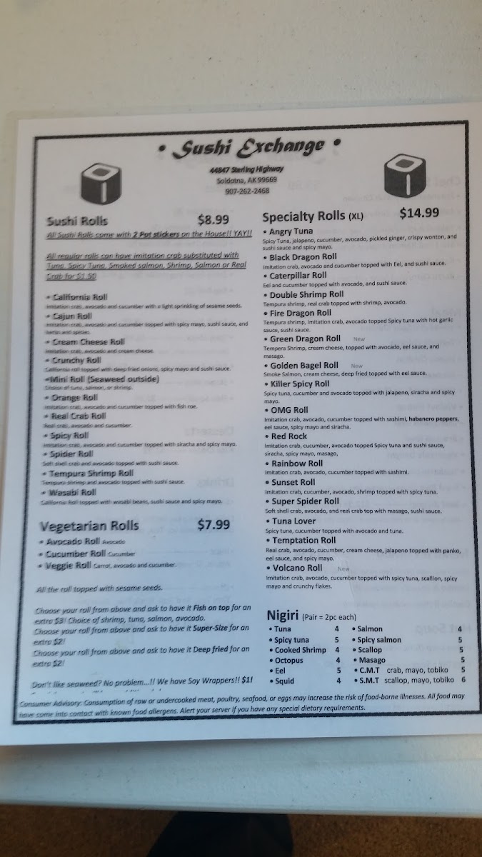 Welcome to Sushi Exchange, the gem of Soldotna, Alaska, where culinary passion meets exceptional quality. Nestled at 44847 Sterling Hwy, this cozy establishment is renowned for its fresh sushi and attentive service. A proud family-run venture, Sushi Exchange offers a delightful menu featuring mouthwatering options such as Miso Soup, Avocado Rolls, and an array of delectable vegetarian selections.